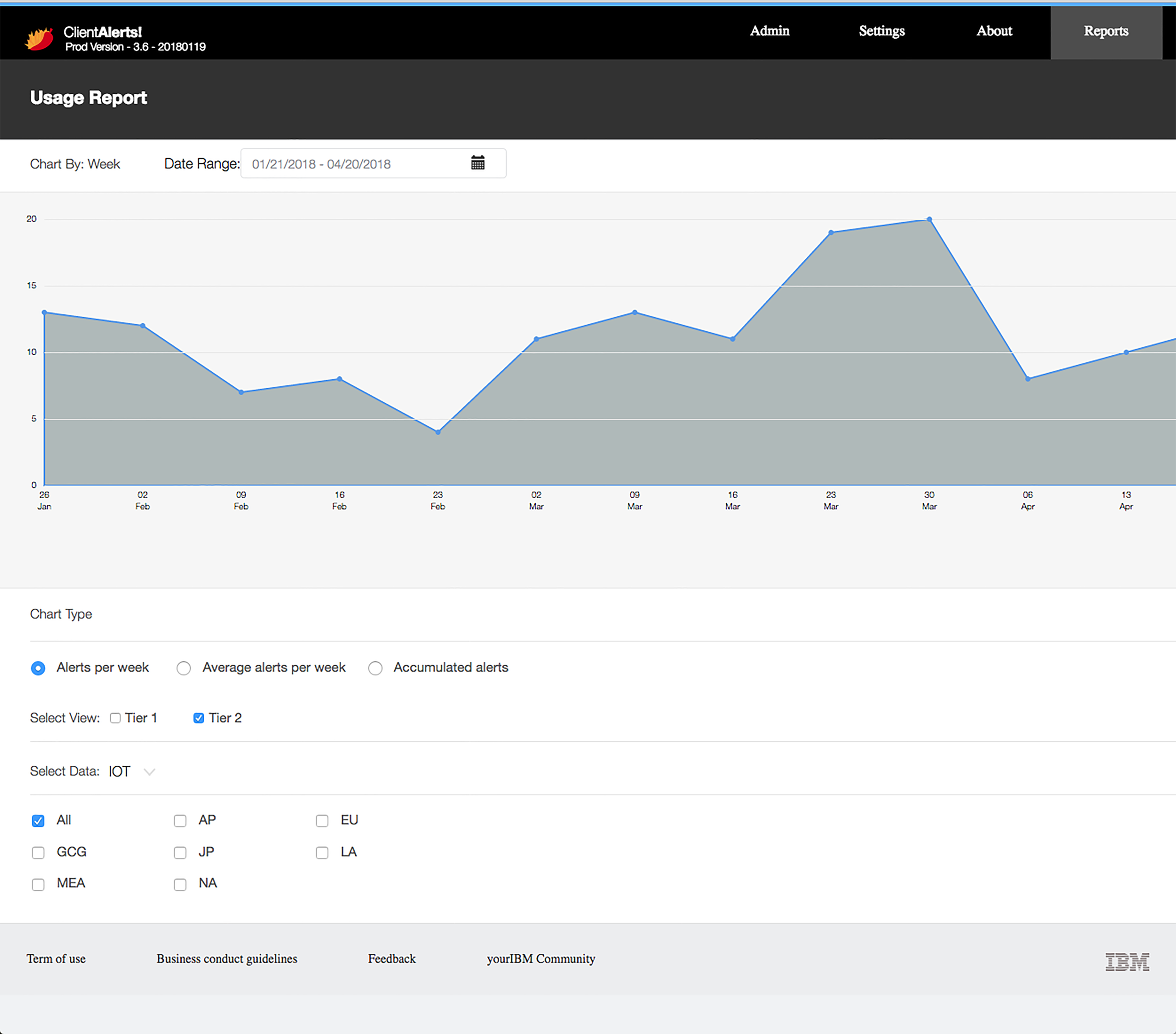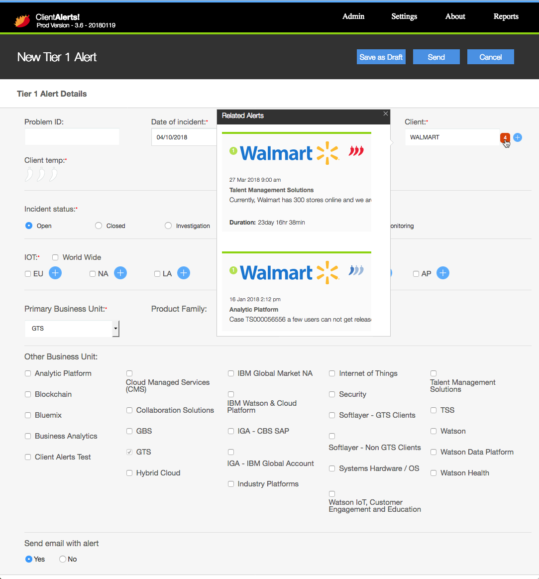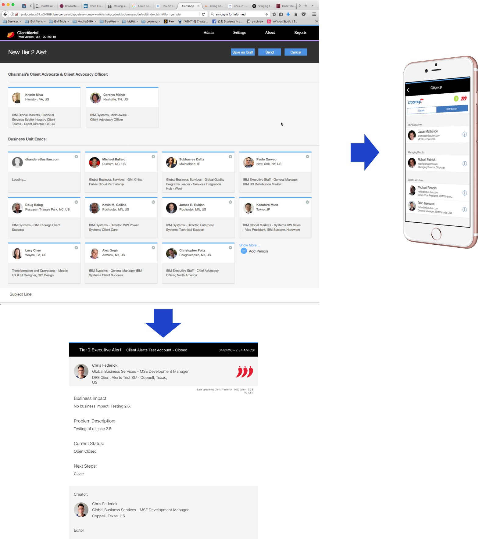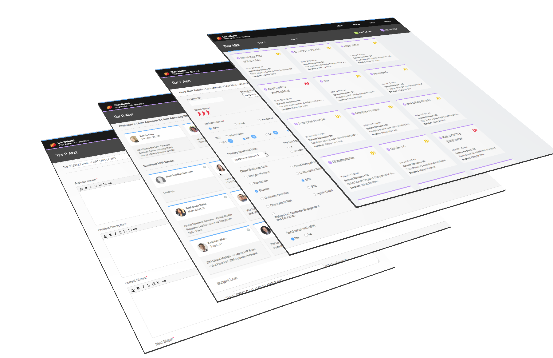 Client Alerts is a two-part project, sponsored by the Chief Advocacy Officer, that keeps IBM Senior Executives informed of significant problems that impact IBM clients.