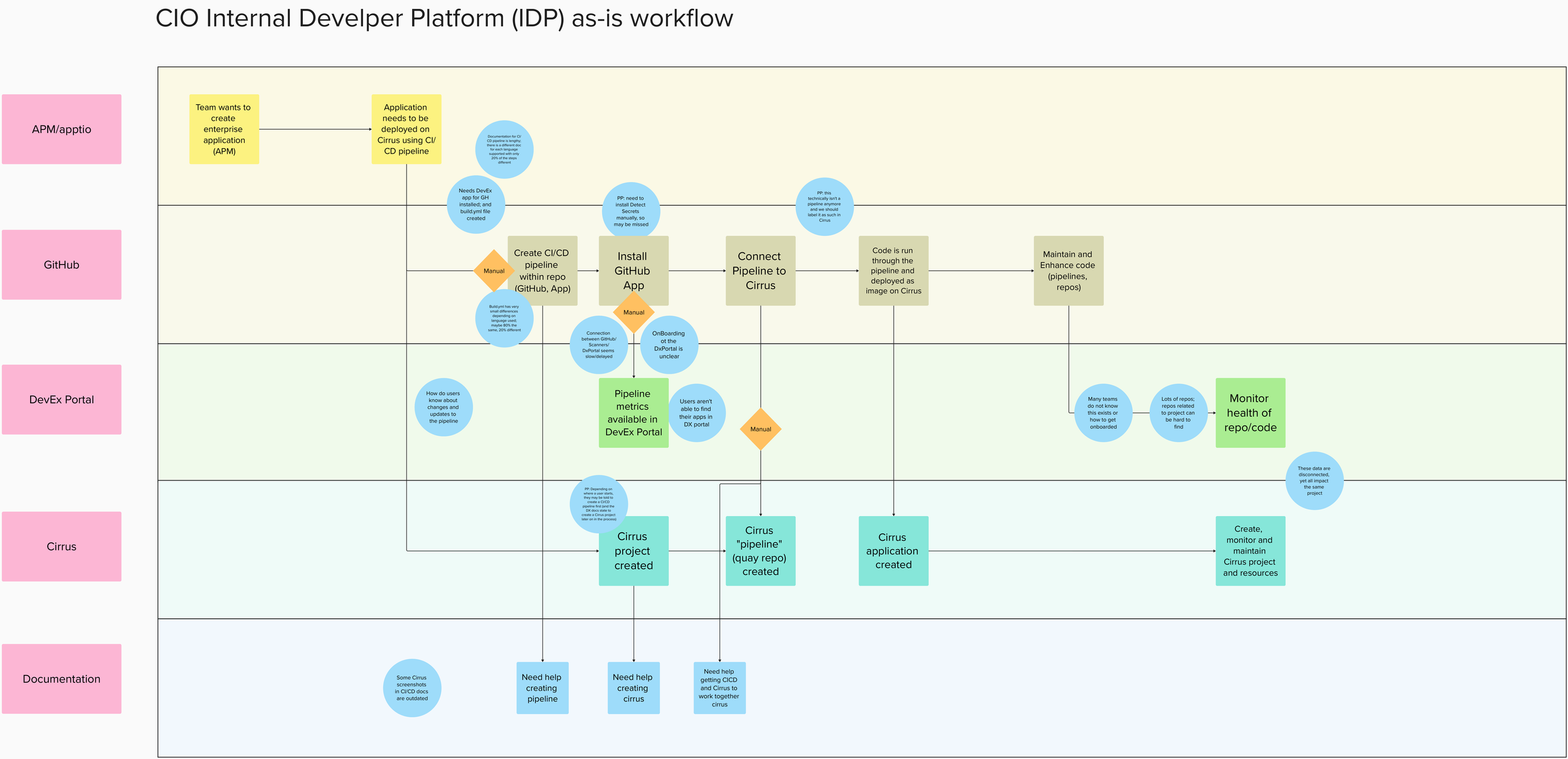Blue circles indicate manual transitions. Swim lanes are individual applications. Green circles and diamonds are system automations and built in workflow.